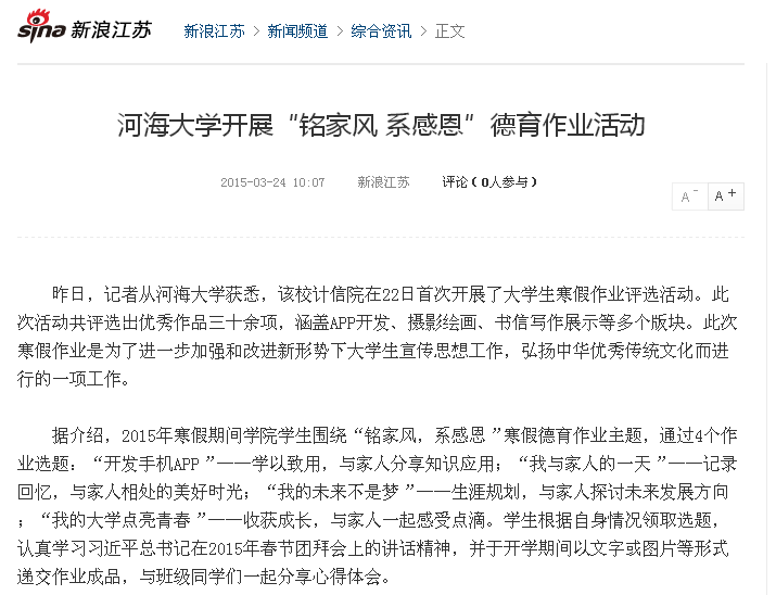 近年来,麻豆传媒 立足专业特色与优势,推进思想政治教育工作新模式,2015年寒假,给学生布置了主题为“铭家风,系感恩”的寒假德育作业,用现代科技平台弘扬与宣传中华优秀传统文化,意义深刻,影响深远。