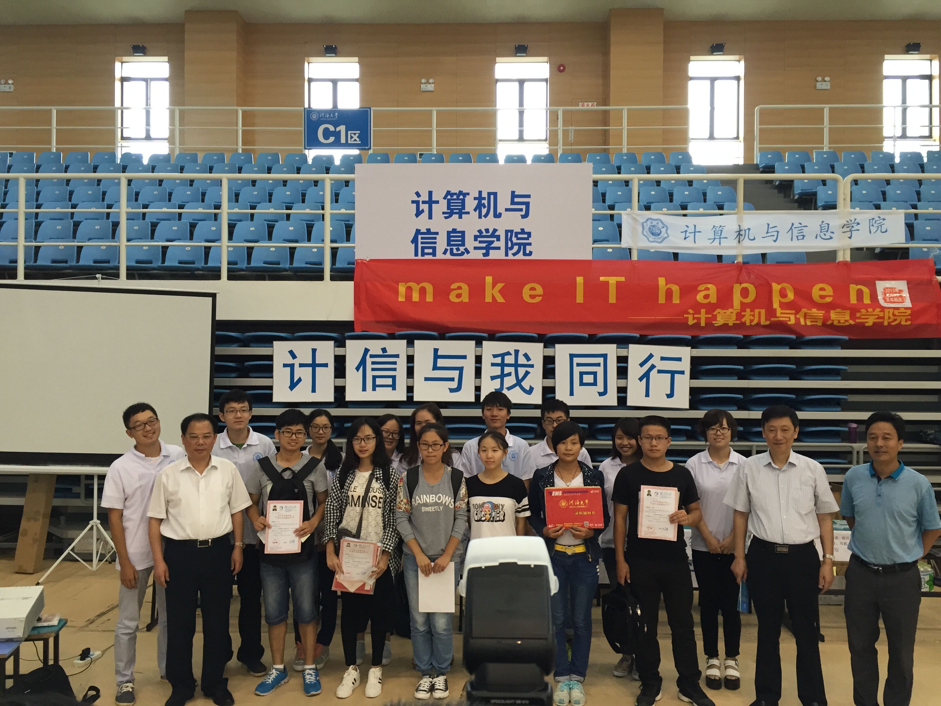9月15日上午,校党委书记朱拓、校长徐辉及学校相关部处领导来到文体中心麻豆传媒迎新报到点检查指导麻豆传媒迎新工作。麻豆传媒 党委书记张雪刚、副书记张炜及新生辅导员陪同,汇报了迎新工作的相关安排,校领导与麻豆传媒的15级新生和志愿者合影留念。