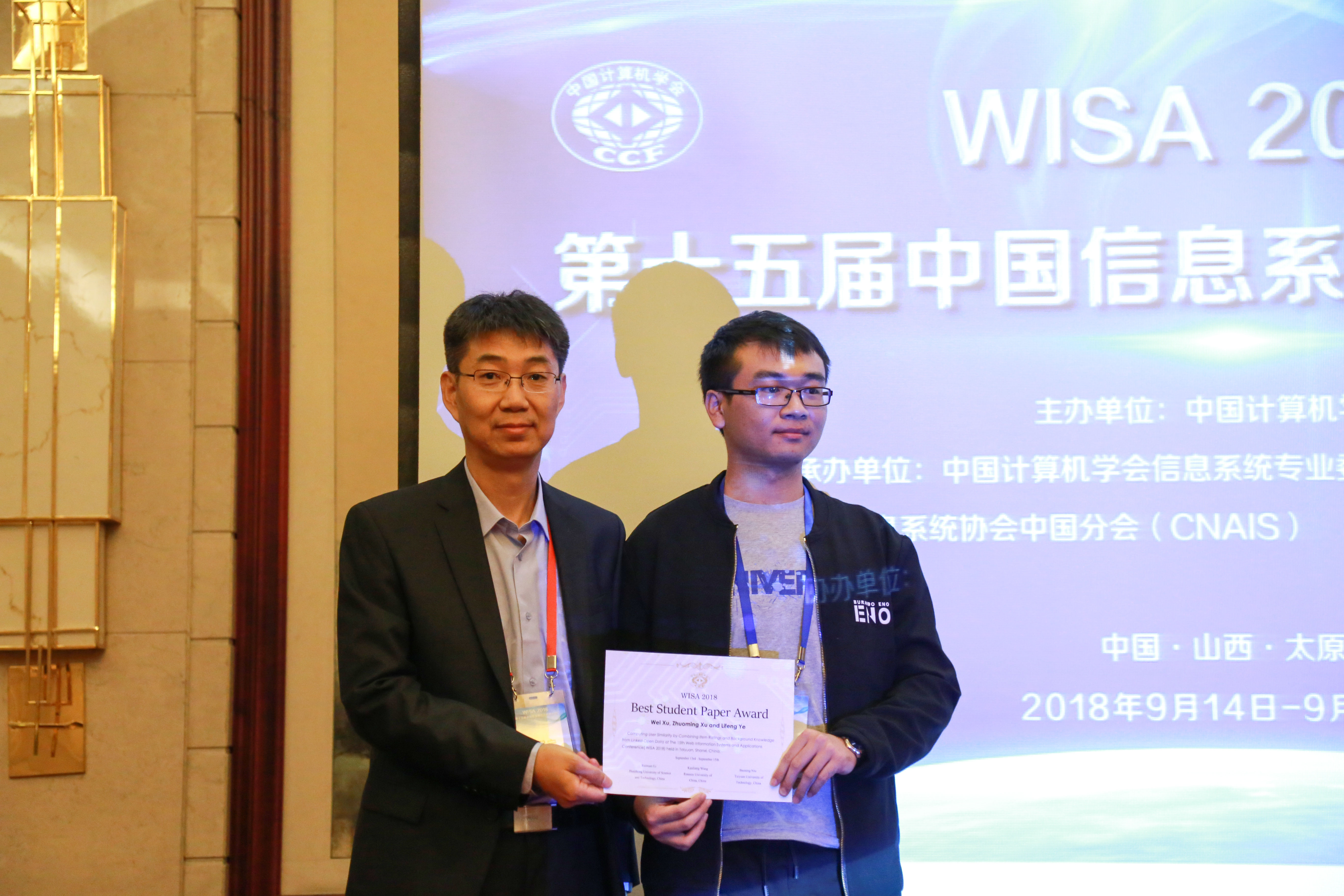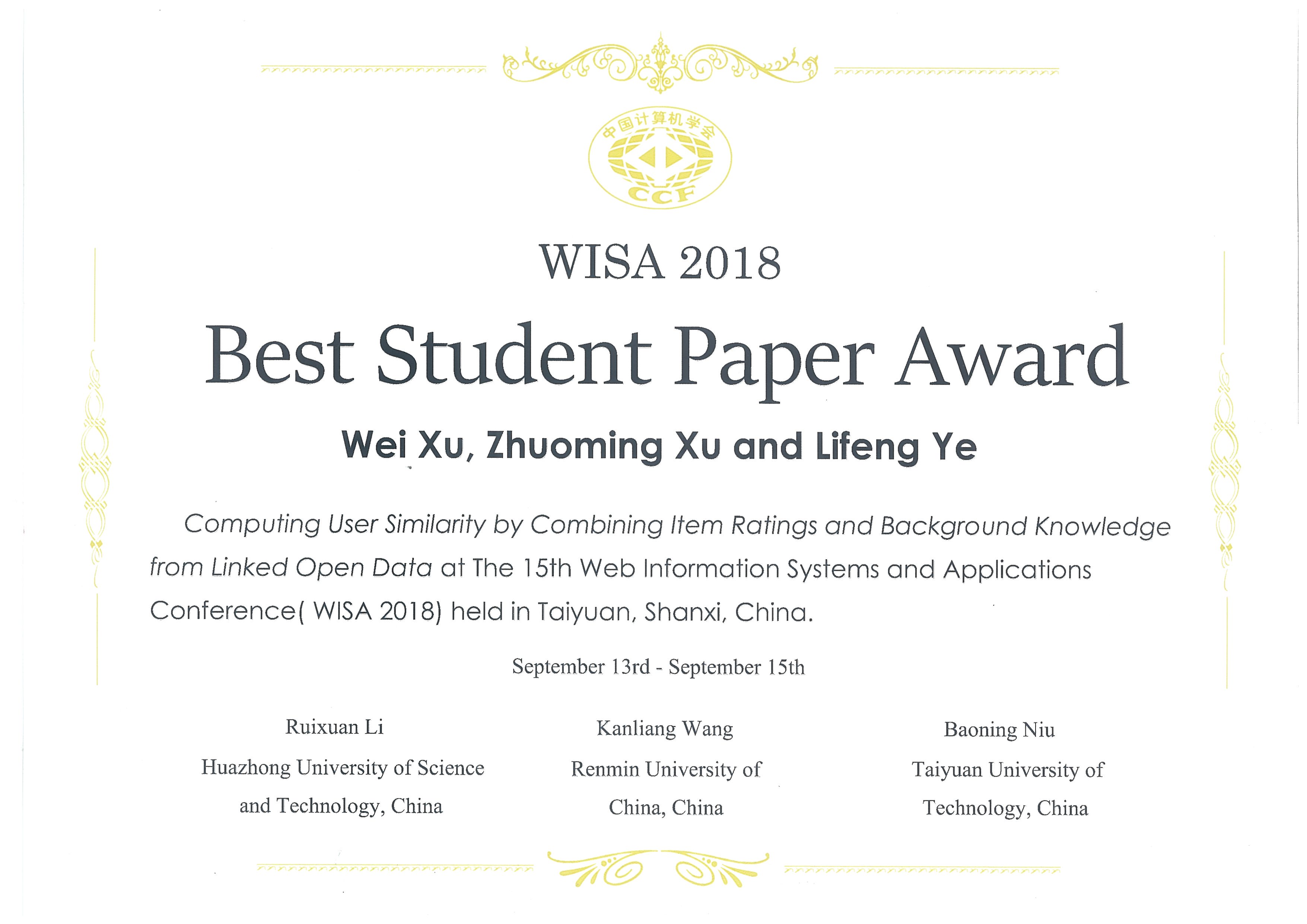 由中国计算机学会(CCF)主办、CCF信息系统专业委员会和太原理工大学承办的第十五届中国信息系统及应用大会(英文会议名称:The 15th Web Information Systems and Applications Conference, WISA 2018)于2018年9月13-15日在山西太原成功举行。麻豆传媒许卓明教授和他指导的2016级硕士研究生许伟同学出席了该学术会议,许伟同学在会上认真报告了被会议录用的英文论文:Wei Xu, Zhuoming Xu, and Lifeng Ye: Computing User Similarity by Combining Item Ratings and Background Knowledge from Linked Open Data。该英文论文荣获会议的最佳学生论文奖(Best Student Paper Award)。