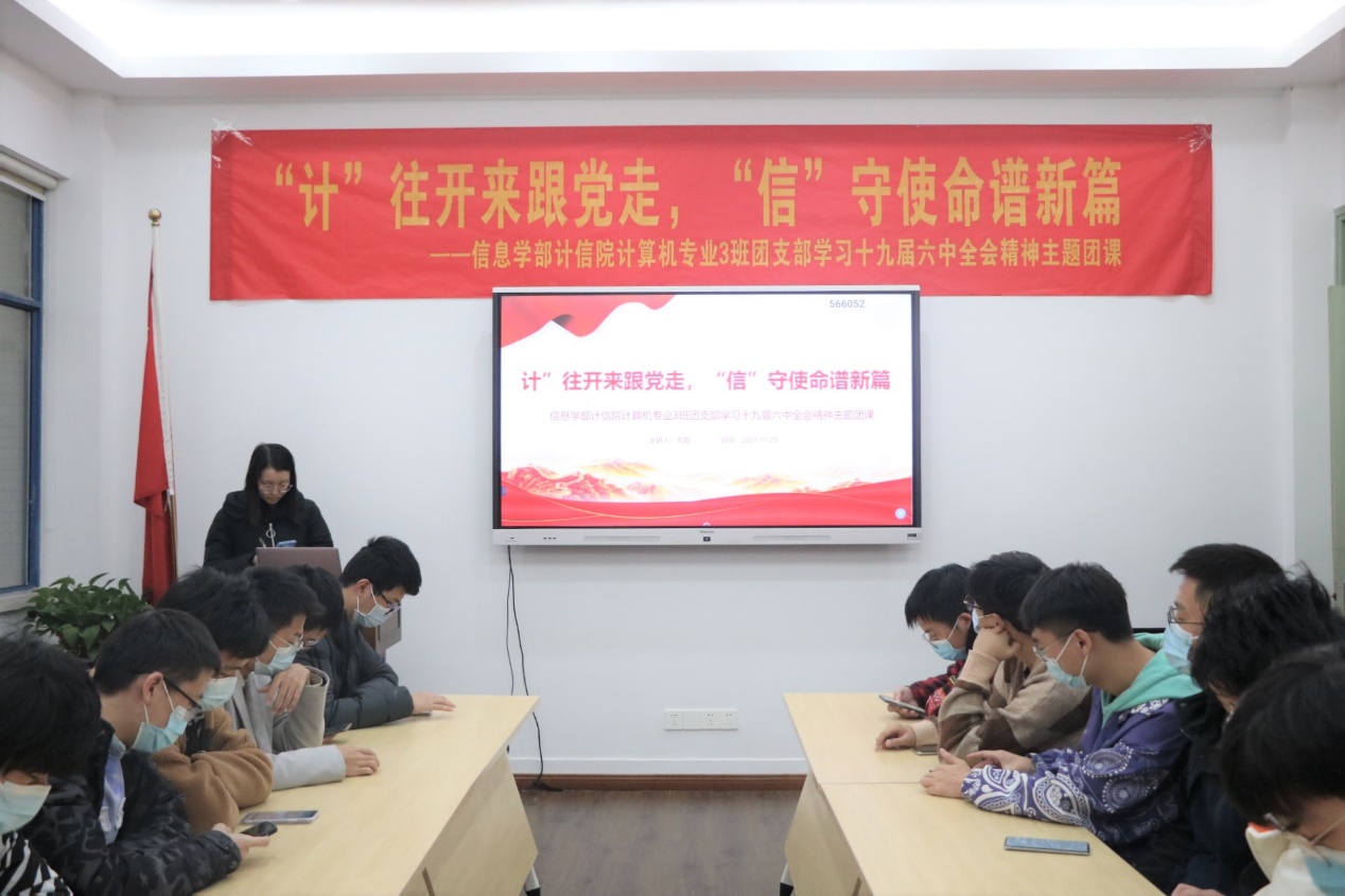 2021年11月25日下午,信息学部计算机与信息麻豆传媒 2018级计算机科学与技术3班团支部召开“‘计’往开来跟党走,‘信’守使命谱新篇”学习党的十九届六中全会精神主题团课。李俊杰常务副校长参加此次主题团课。