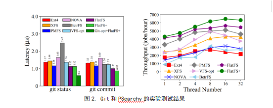 论文实验对比了两种商用文件系统和五种研究型文件系统,采用标准的基准测试程序集(如Filebench,FxMark)和真实的应用程序(如版本控制工具Git,大数据仓库Hive,文件索引软件PSearchy)。FlatFS+在文件路径解析的效率、扩展性,目录文件遍历等方面均有较大的提升,实验结果表明FlatFS+最多能提升4倍的文件元数据操作性能。