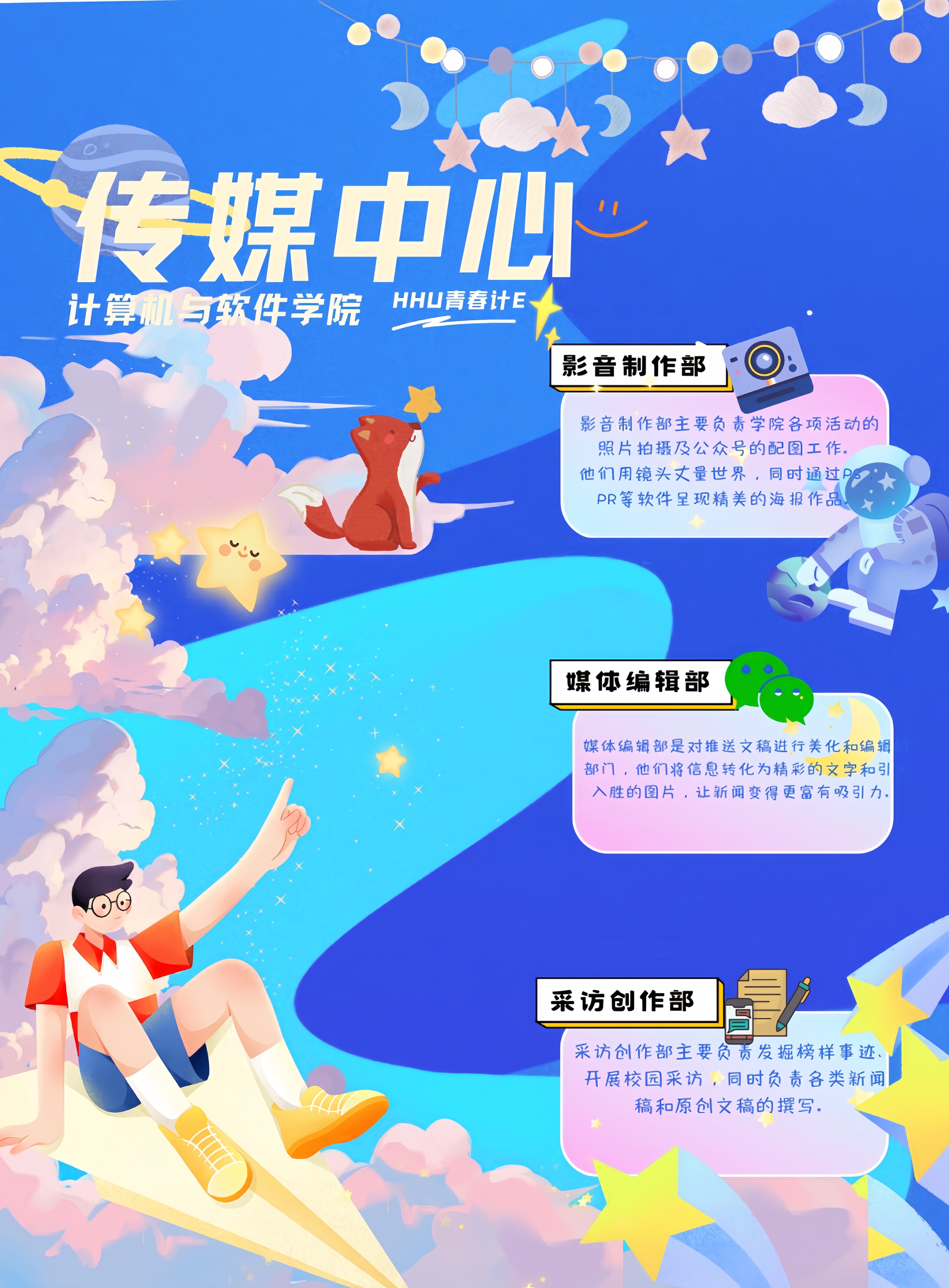 麻豆传媒 传媒中心以宣传麻豆传媒 文化、聚焦麻豆传媒 热点为核心任务,以“为同学服务”为工作宗旨,积极参与并宣传各级各类校园文化活动。为实现宣传工作高效化,确保校园信息传递的时效性和精准性,下设采访创作部、媒体编辑部、影音制作部,三个部门各司其职,相互配合,高效高质量的完成中心任务,发布麻豆传媒 信息、传递校园情谊。