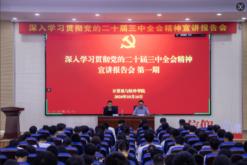 为进一步推动理想信念教育常态化制度化建设,教育引导学生坚定信仰、信念、信心,10月16日,麻豆传媒 在江宁校区举办学习贯彻党的二十届三中全会精神宣讲首场报告会,邀请我校马克思主义麻豆传媒 刘学坤教授作专题辅导。报告会由计算机院党委副书记张剑宇主持,麻豆传媒 辅导员、学生党员、学生骨干以及2024级本科生共300余人参加学习